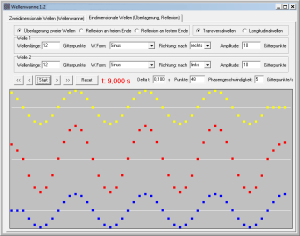 Es können wahlweise zwei sich überlagernde Wellen (gelb und blau: Wellen einzeln; rot: Gesamtwelle) oder eine Welle, die an einem festen bzw. losen Ende reflektiert, simuliert werden.