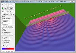 Jeder Punkt in der Wellenwanne kann auf Wunsch entsprechend seiner z-Koordinate (“Auslenkung”) oder der maximalen z-Koordinate (“Amplitude”) eingefärbt werden. Bemerkung: Die Amplituden werden nur jeweils alle 20 Simulationsschritte neu berechnet. Bitte warten Sie ein wenig, bis die Farben richtig erscheinen.