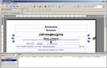 - Jedes Objekt besitzt einen Satz von Ereignissen (unterer Fensterteil!), für die jeweils ein Skript erstellt werden kann (benutzt wird BeanShell). Dem Skript werden initial die Objekte objekt (Objekt, dem das Ereignis zugeordnet ist), schueler, klasse, zeugnis und schule übergeben, mit deren Methoden das Objekt mit Werten aus der Datenbank vorbesetzt werden kann und auf Benutzereingaben (z.B. Auswahl in einem Drop-Down-Feld) reagiert werden kann. Die Funktion ist bisher noch experimentell.