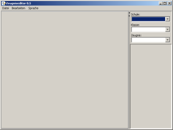 Das Programm zeigt zustandsabhängig nur die möglichen Funktionalitäten und sieht daher nach dem Start recht spartanisch aus (siehe rechts). Die Lehrkräfte bekommen von ihrer Schulleitung zusammen mit dem Programm eine Datendatei als Ausspielung aus dem Schuldverwaltungsprogramm, die die notwendigen Informationen über ihre Klassen zusammen mit den vorausgefüllten Zeugnissen enthält. Sie kann mit Datei→Datendatei öffnen eingelesen und mit Datei→Datendatei speichern wieder gespeichert werden. Die gespeicherte Datei bringt die Lehrkraft dann wieder in die Schule zum Einlesen in ASV und zum Drucken der Zeugnise.