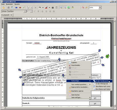 - Die üblichen Funktionen vektororientierter Zeichenprogramme sind bei erscheinen des Kreuzcursors über das Kontextmenü nutzbar (Gruppieren, Ausrichten, Verteilen, …)
