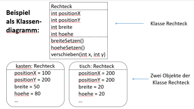 Die Objekte kasten und tisch sind beides Instanzen der selben Klasse Rechteck, d.h. sie haben deren Attribute und Methoden. Insbesondere liegt der Programmcode für die Klasse Rechteck nur ein Mal im Arbeitsspeicher vor. Für jedes der beiden Objekte ist jedoch eine andere Stelle im Arbeitsspeicher vorgesehen, an der seine Attributwerte liegen.