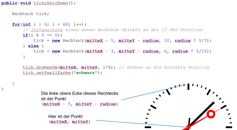 // Instanzieren und Zeichnen an der 12:00:00 Uhr-Position: sekundenzeiger = new Sekundenzeiger(mitteX, mitteY, radius); // Drehen um einen Punkt in einem bestimmten Winkel: sekundenzeiger.drehenUm(mitteX, mitteY, 0.1/12);