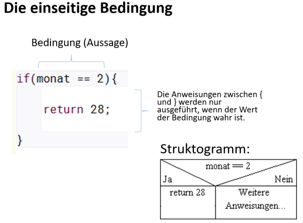 monat = 2ist eine Anweisung, die der der Variablemonatden Wert 2 zuweist.monat == 2ist eine Aussage. Der Wert der Variablemonatwird mit 2 verglichen. Entsprechend hat die Aussage den Werttrueoderfalse.