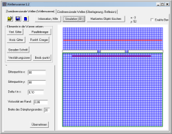 Ist das Schaltfeld “exakte Berechnung” eingeschaltet, so wird die Bewegung der Wasseroberfläche nicht mit der Methode kleiner Schritte simuliert, sondern exakt berechnet. Dadurch erscheint die Wasseroberfläche als exakte Überlagerung von sinusförmigen Kreiswellen. Der Grund für diese Option ist, dass mit der Methode kleiner Schritte am Ort der Erreger selbst nie ein Schwingungsknoten entstehen kann. Dies wiederspricht der Theorie, die in der Schule gelehrt wird. Anmerkung: Im Modus “Exakte Simulation” können keine Spalte/Gitter simuliert werden.