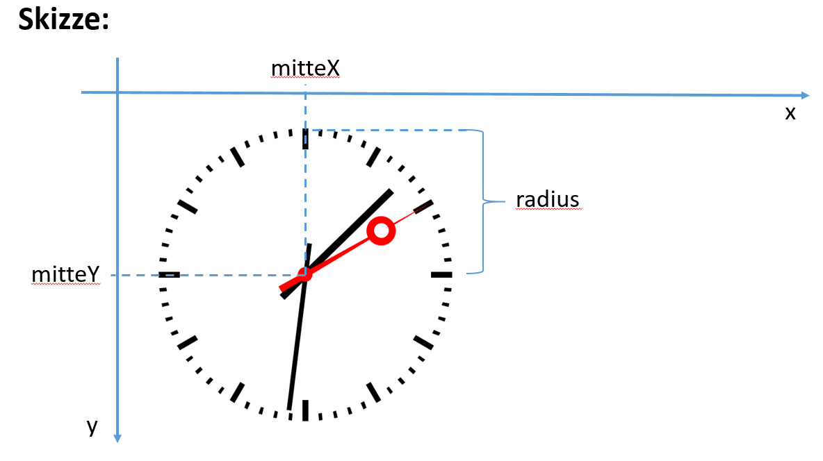 // Instanzieren und Zeichnen an der 12:00:00 Uhr-Position: sekundenzeiger = new Sekundenzeiger(mitteX, mitteY, radius); // Drehen um einen Punkt in einem bestimmten Winkel: sekundenzeiger.drehenUm(mitteX, mitteY, 0.1/12);
